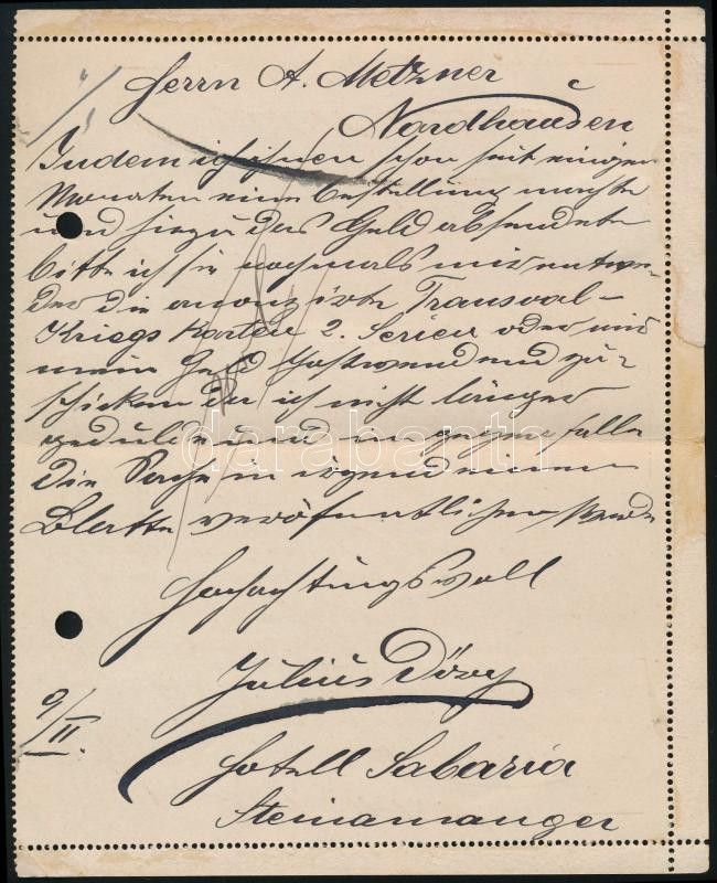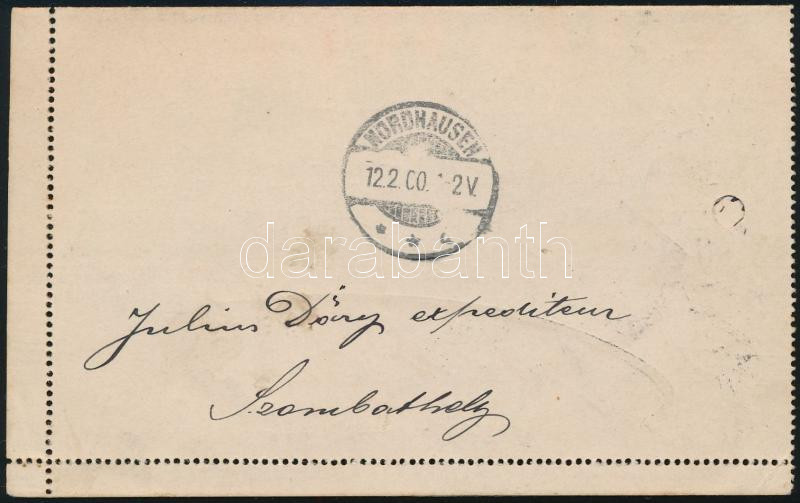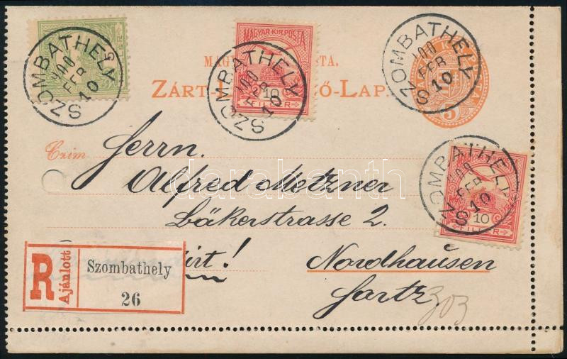 1900 5kr díjjegyes zárt levelezőlap vegyes bérmentesítéssel Turul 5f + 2 x 10f kiegészítéssel Németországbaba küldve "SZOMBATHELY" - Nordhausen Ritka és szép darab RRR!
