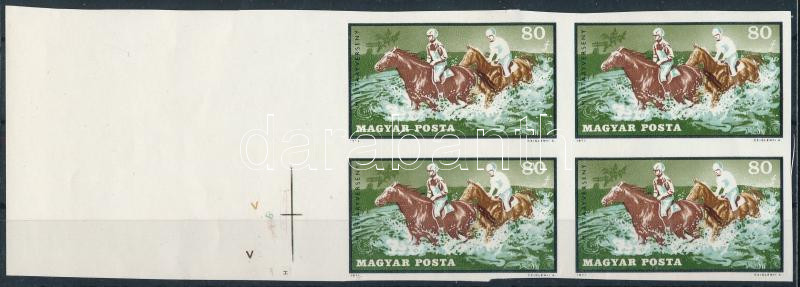 1971 Lósport 80f ívszéli 4-es tömb vágott fázisnyomat gumi nélküli papíron, piros és fekete színnyomat nélkül