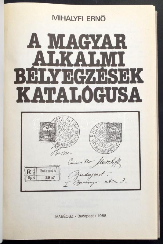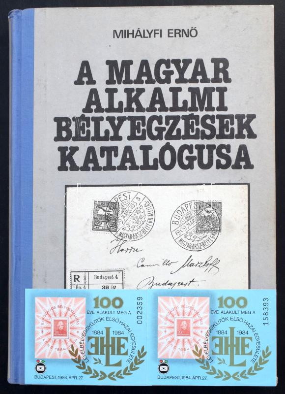 Mihályfi Ernő: A magyar alkalmi bélyegzések katalógusa (Budapest, 1988) (2 emlékív a borítóra ragasztva)