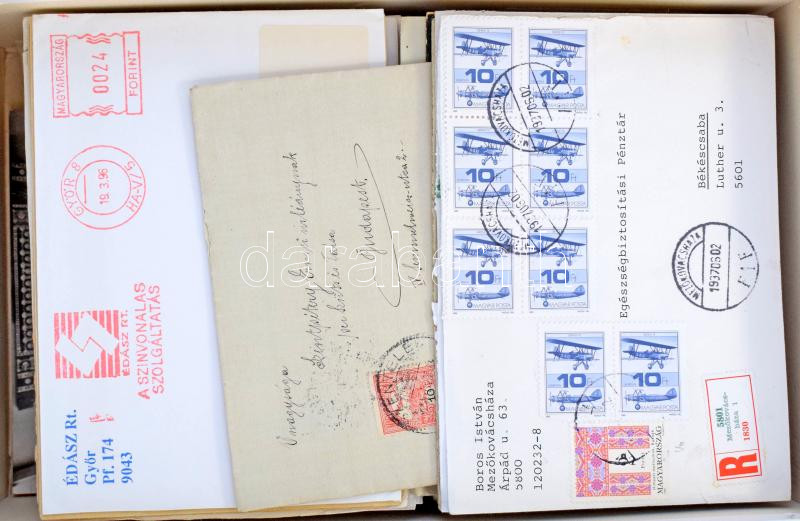 212 db magyar + 54 db külföldi küldemény, köztük régebbiek, sokbélyeges bérmentesítések, légiposta, ajánlott; változatos tétel, dobozban