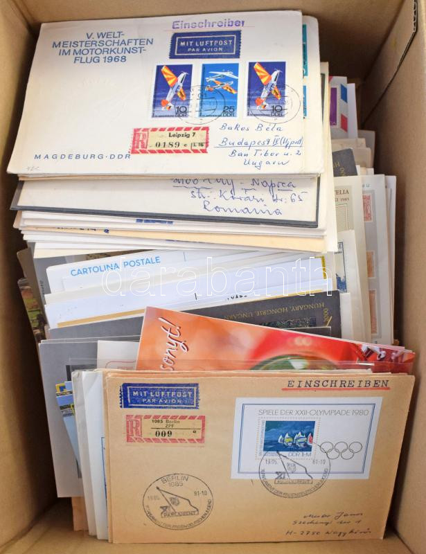 Kb 400-500 db döntően külföldi levél, díjjegyes, űrlap dobozban ömlesztve, régebbi és modern