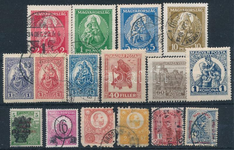 1871-1932 Kis vegyes tétel: Réznyomat 2kr, 5kr és Hadisegély 1K, 2K + Hadifogoly, Keskeny Madonna, Nagy Madonna sor stecklapon