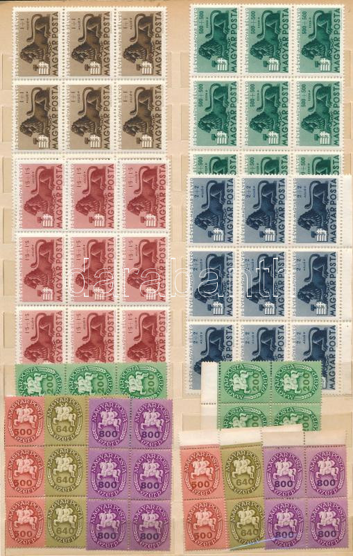 1945-1946 Vértanúk négyestömb, Bélyegjubileum 9-es tömb sorok, Lovasfutár 10 sor 4-es és 6-os tömbökben (27.200)
