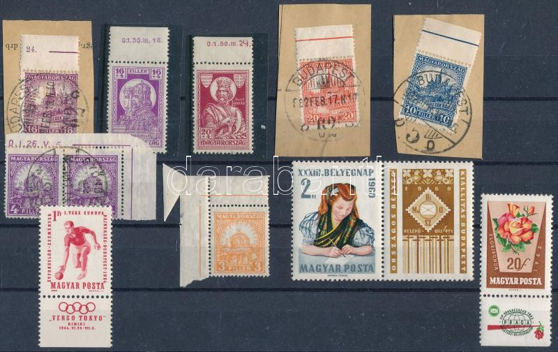 1945 előtti és utáni 11 db bélyeg ívszéli dátummal vagy más nyomdai jelzéssel, illetve szelvénnyel, stecklapon