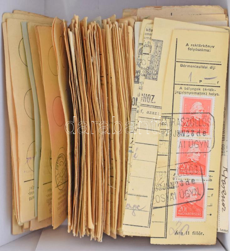 310 db régi csomagszállító szelvény / kivágás változatos bélyegzésekkel, köztük postaügynökségiek is