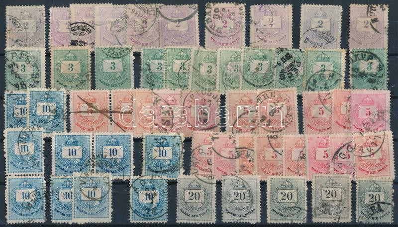 54 db Színesszámú bélyeg stecklapon, közte szép bélyegzések, javítások, fogazatra és vízjelre átnézetlen
