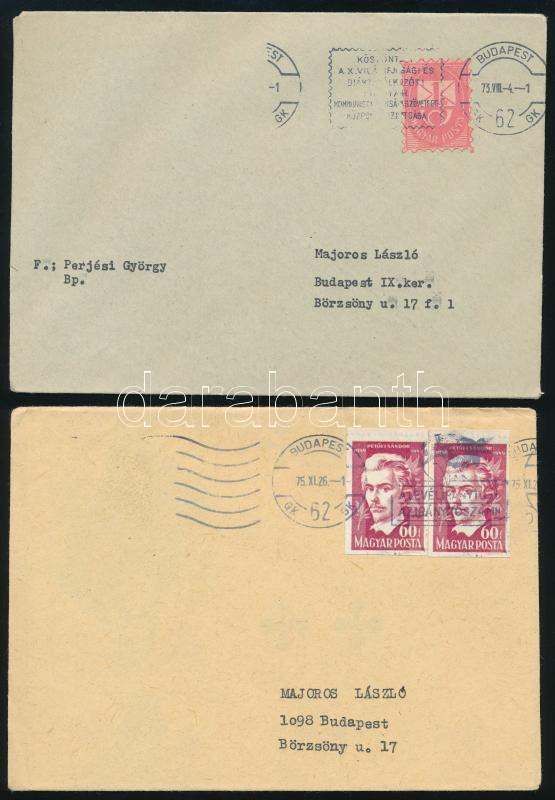 9 db küldemény, közte vágott bélyegekkel bérmentesített, 1 db levelezőlap kivágással, 6 db levél néma bélyegzővel