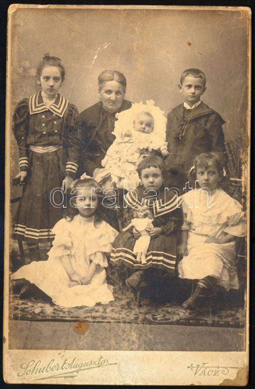cca 1910 Hat testvér portréja, keményhátú fotó Schubert Augusztin váci műterméből, karcolásokkal, 16,5×10,5 cm