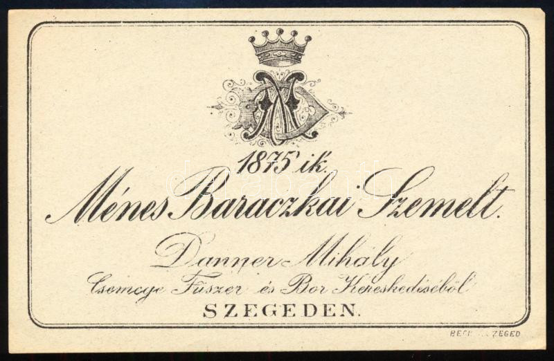 1875-ik Ménes Baraczkai Szemelt Danner Mihály Csemege Fűszer és Bor Kereskedéséből Szegeden, borcímke, 7,5x11,5 cm