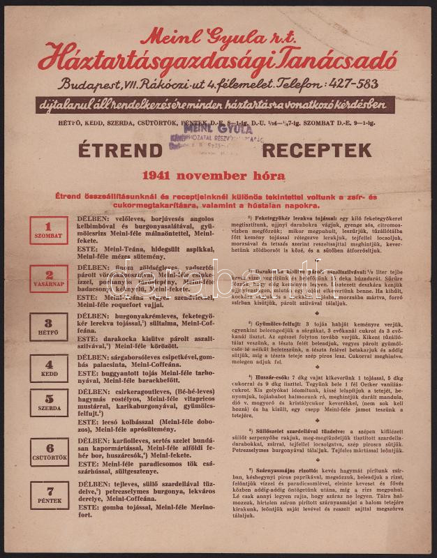 1941 Meinl Gyula Rt. Háztartásgazdasági Tanácsadó étrend és receptek