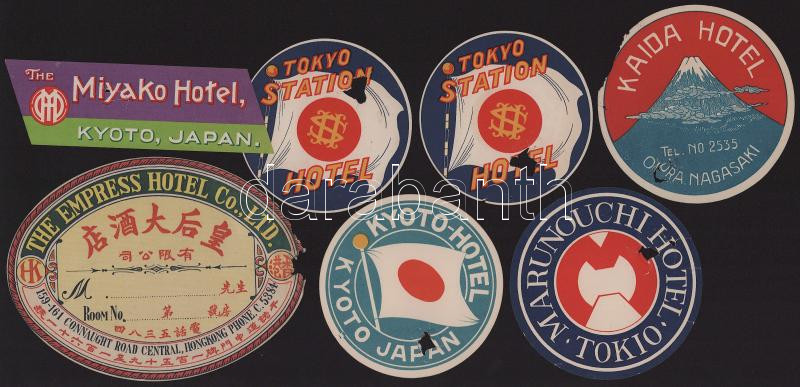 6 db háború előtti japán hotelcímke, bőröndcímke vegyes állapotban / 6 vintage pre-war Japanese hotel labels, luggage labels in mixed condition