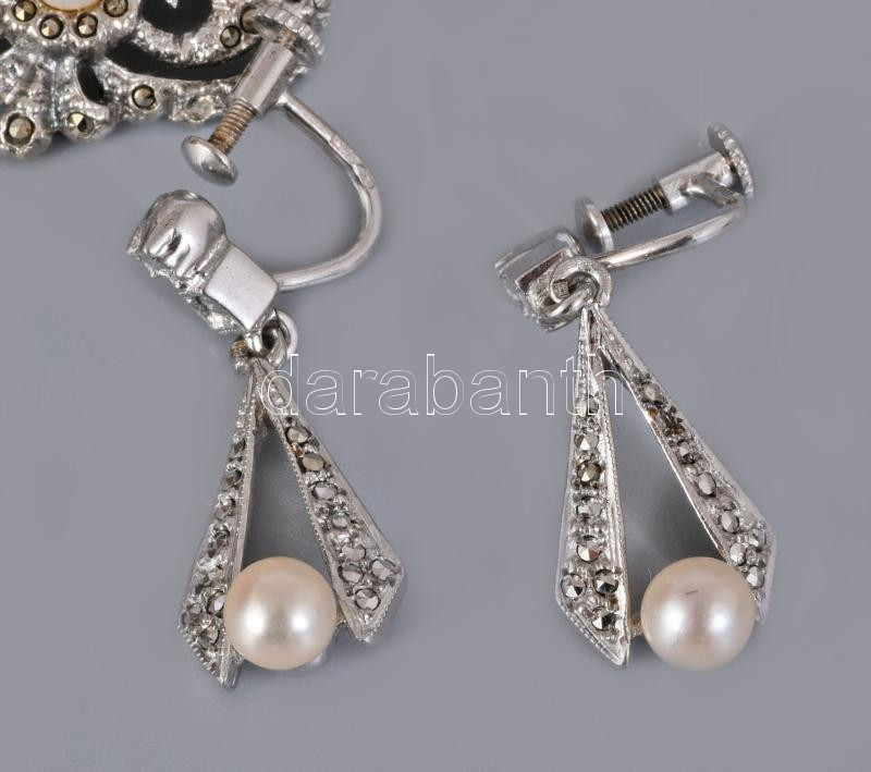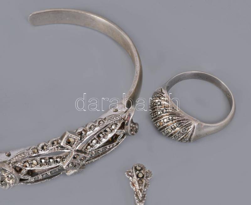 5 részes ezüst (Ag) ékszer szett, markazitokkal, karkötő, gyűrű, fülbevaló pár, függő, 1937-1966 és 1966-1998 közötti fémjel, 800 ezrelékes ezüst, bruttó 36,7g