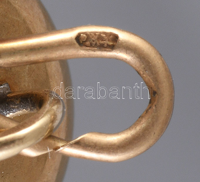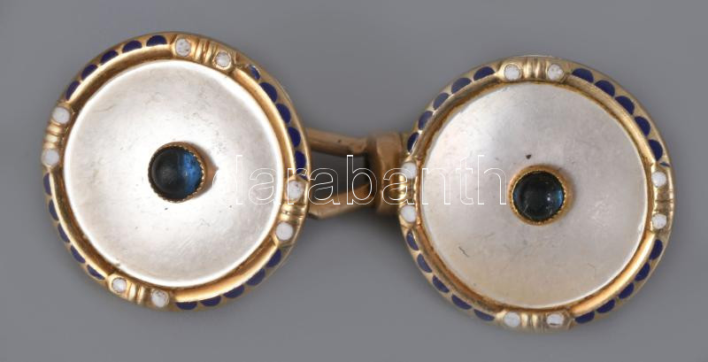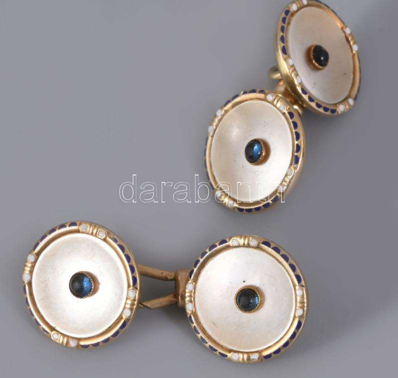 Arany (Au) mandzsetta pár, gyöngyház és kő berakással, zománcozott díszítéssel, jelzett, 1902-1937 közötti behozatali jel, 14 karátos arany, bruttó 6,07g