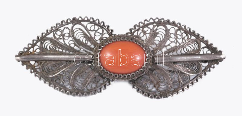 Ezüst (Ag) bross, csiszolt korall berakással, filigrán, jelzett, h: 6 cm, bruttó 8,4g