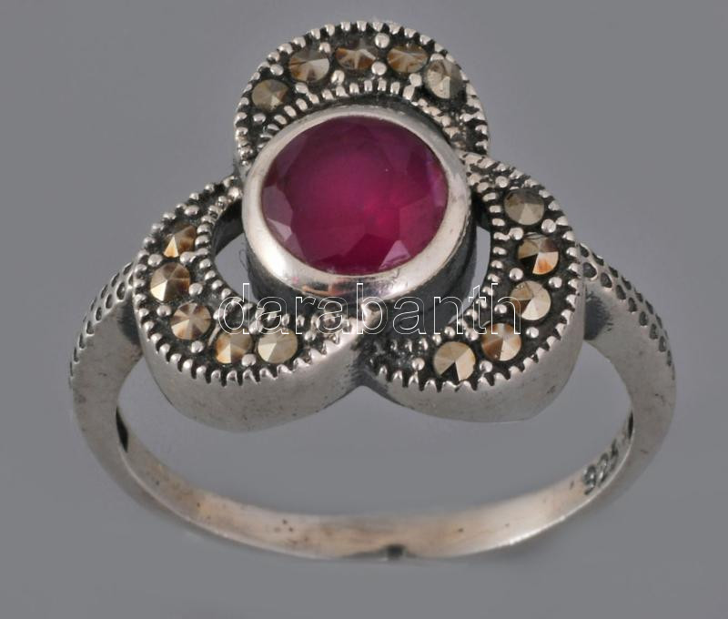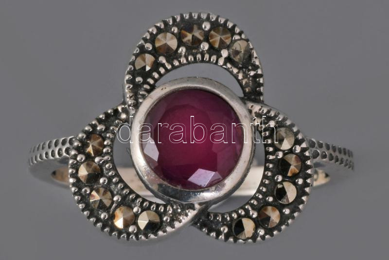 Ezüst (Ag) gyűrű szintetikus rubinnal és markazittal, jelzett, méret: 56, bruttó: 3,93 g