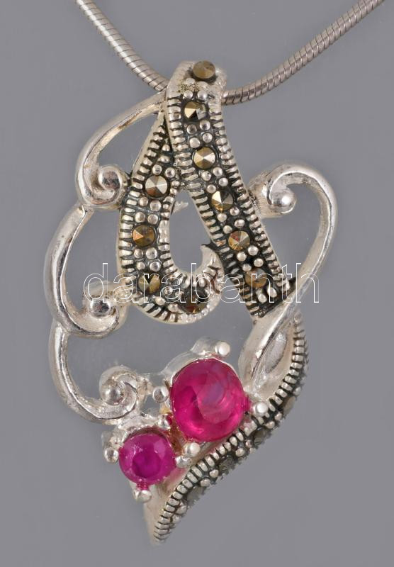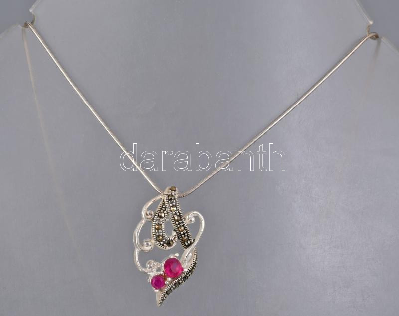 Ezüst (Ag) kígyó nyaklánc szintetikus rubinnal és markazittal díszített medállal, jelzett, h: 42 cm, bruttó: 7,9 g