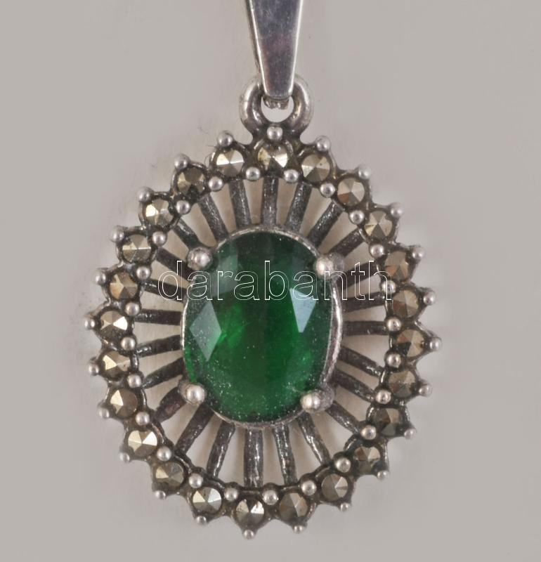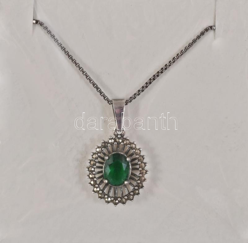 Ezüst (Ag) venezianer nyaklánc zöld köves medállal, h: 41 cm, bruttó: 5,34 g