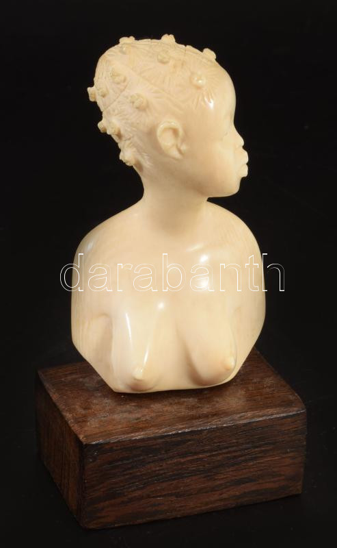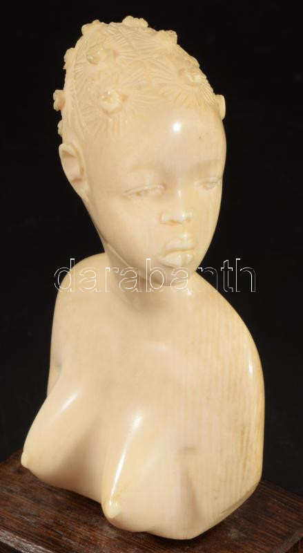 Antik afrikai csont női büszt szobor, fa talapzaton, m: 11,5 cm