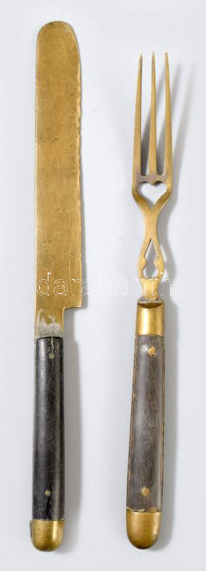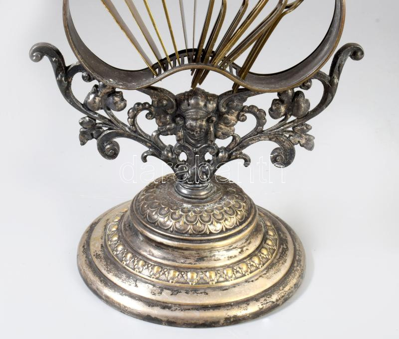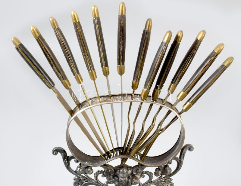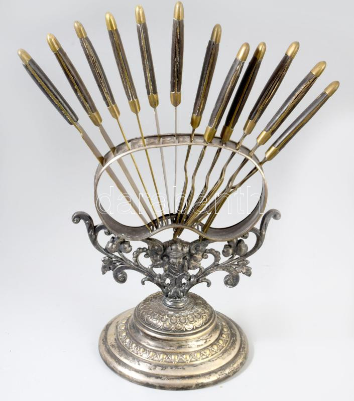 Antik bronz és fa süteményes szett, ezüstözött tartón, 6 személyes, m: 26 cm