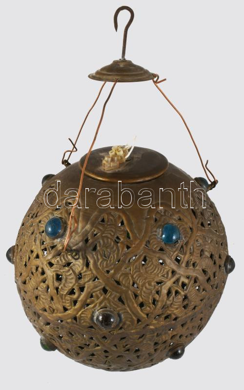 Egyiptomi kézzel készült trébelt bronz mennyezeti lámpa, d: 32 cm