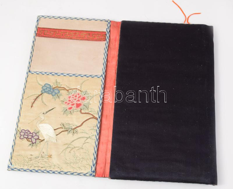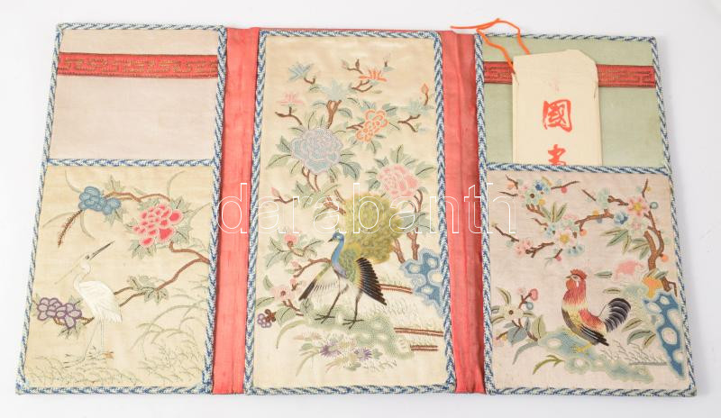 Japán hímzett selyem irattartó, benne kézzel festett könyvjelzővel. Kihajtható. XIX. sz. 36x20 cm