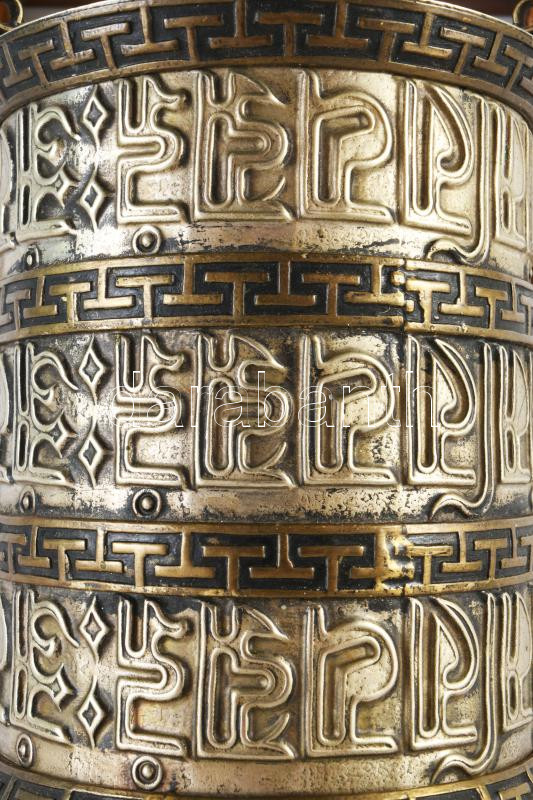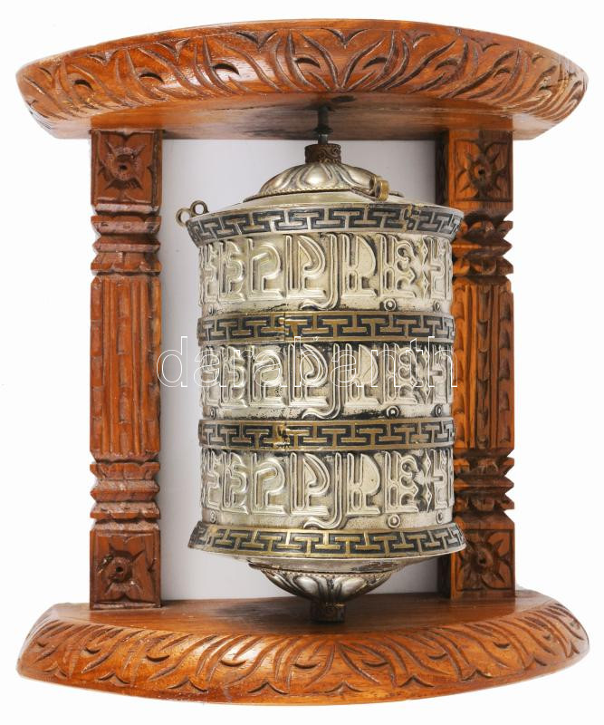 Tibeti imamalom, benne a mantrával. 21x23 cm Fa, fém, réz.