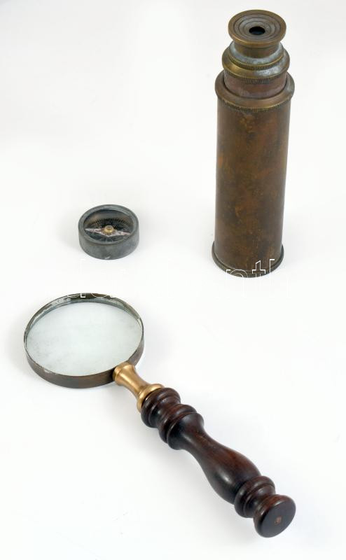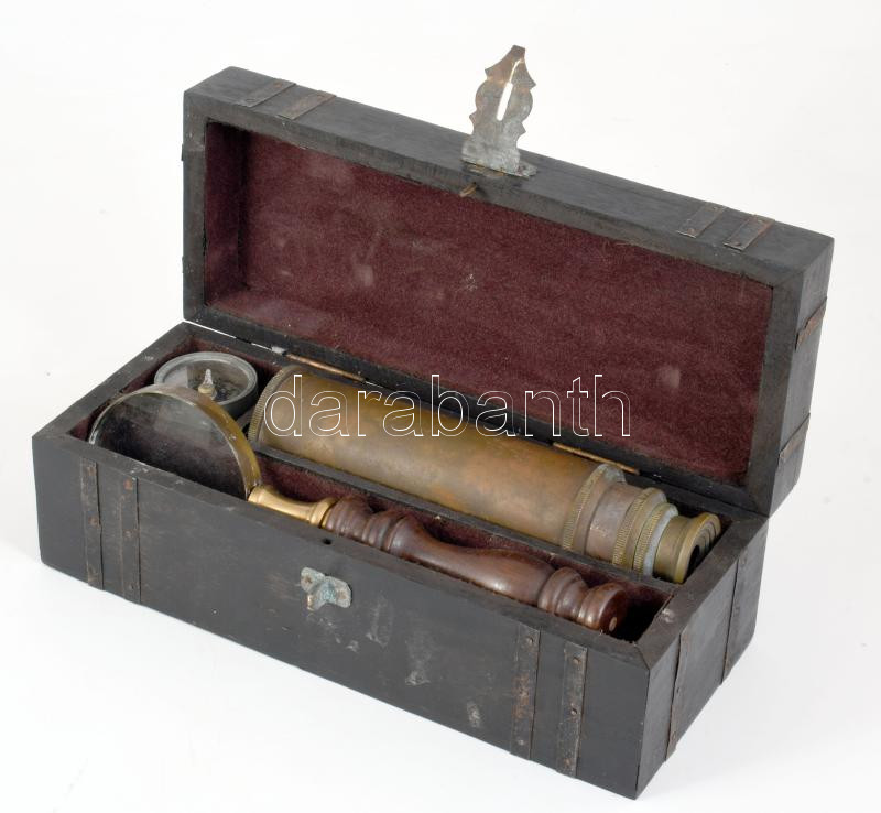 cca 1900 Antik távcső, nagyító és iránytű, fa dobozban, 22x9 cm