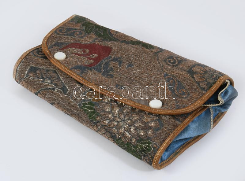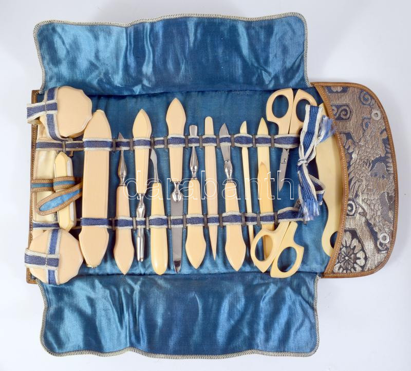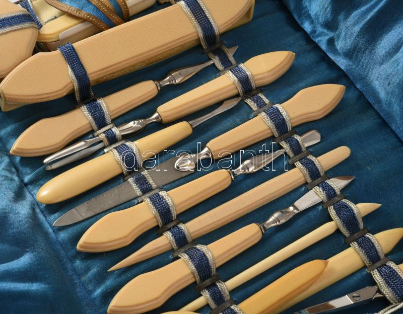 cca 1920 Csontutánzat utazó pipere készlet, tartóban.