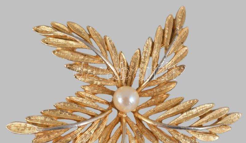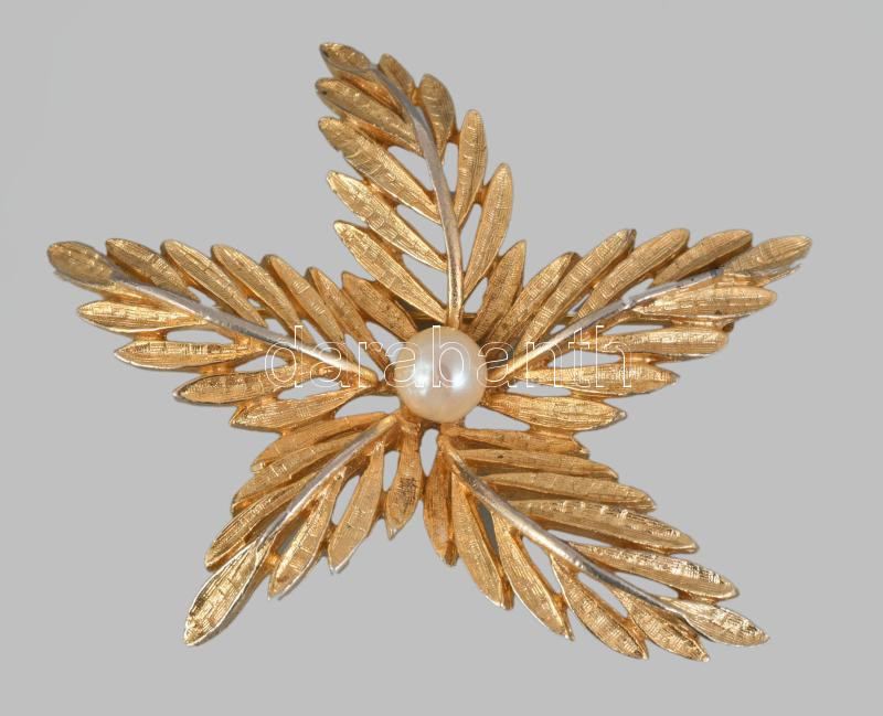 Aranyszínű leveles bross tenyésztett gyöngy díszítéssel, jelzett (Capri), d: 6 cm
