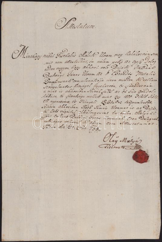 1788 Tura, Olay Mátyás tiszttartó által kiállított "Attestatum" (bizonyítvány, bizonyságlevél) Bakonyi János bujáki kasznár részére, gyűrűspecséttel