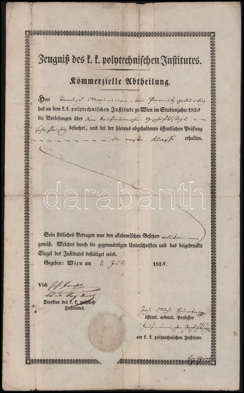 1838 Bécs (Wien), a Cs. és Kir. Politechnikai Intézet (K. k. Polyteschnische Institut) által kiállított bizonyítvány, Johann Joseph von Prechtl (1778-1854), az intézet alapítója és első igazgatója aláírásával, papírfelzetes viaszpecséttel