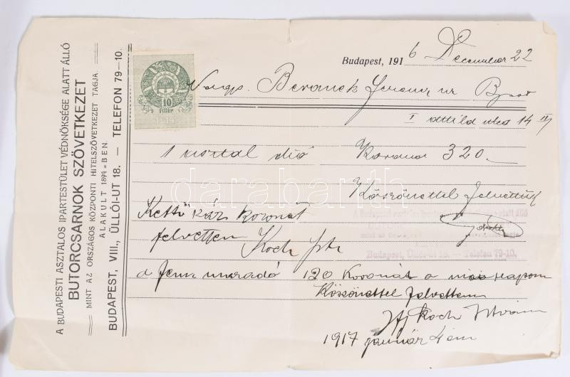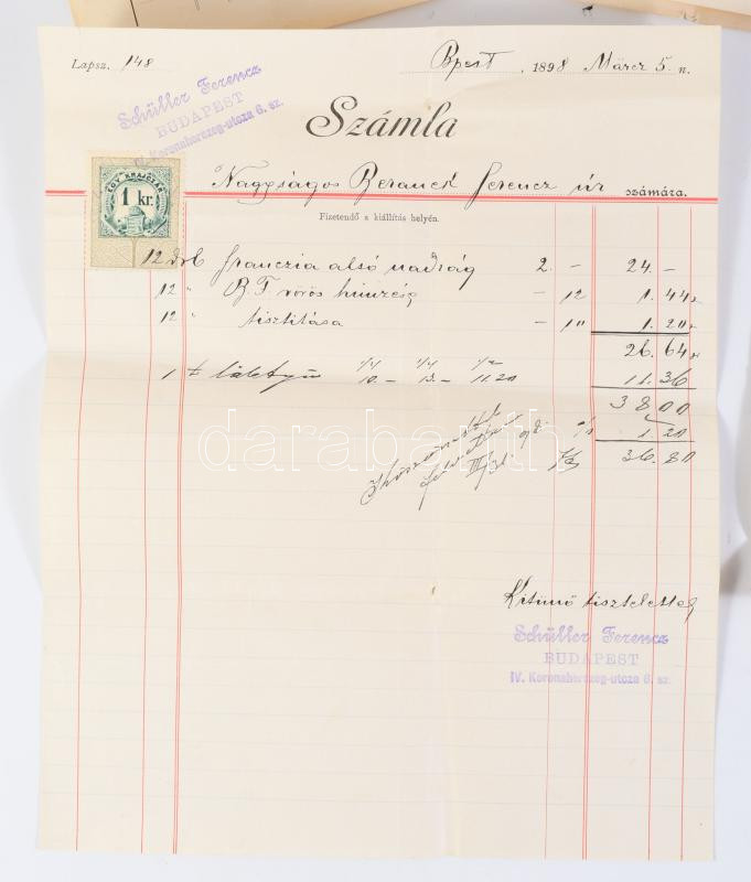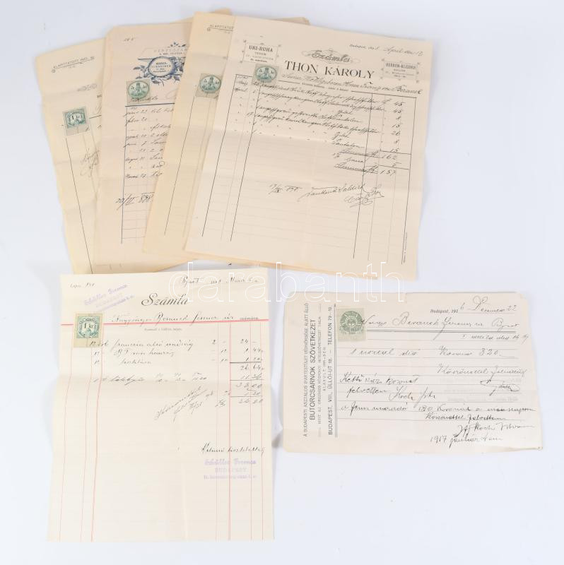 1897-1916 6 db fejléces számla (Kállai Mór férfiszabó, Thon Károly, stb.), okmánybélyegekkel