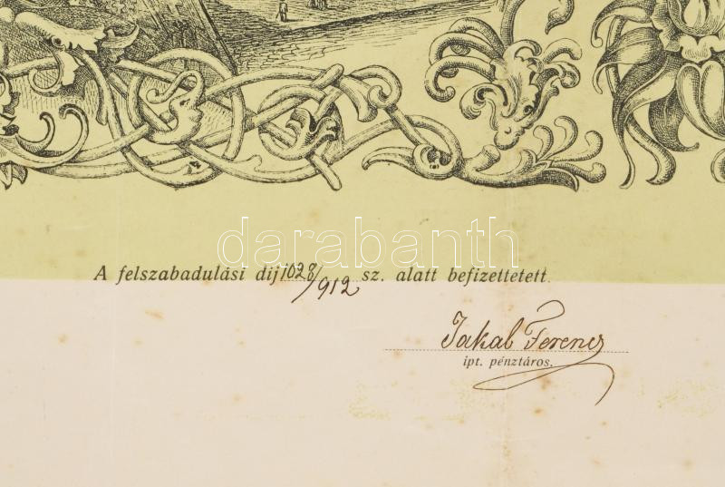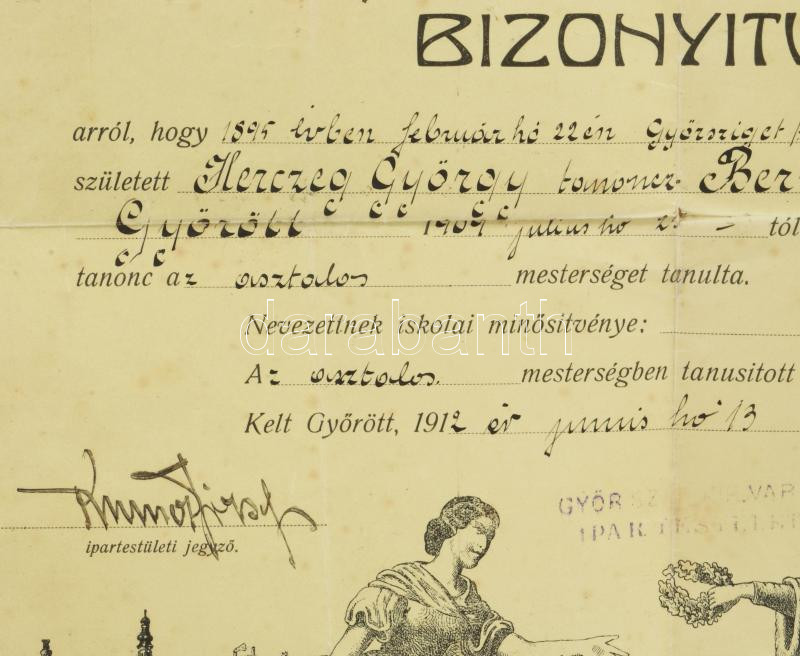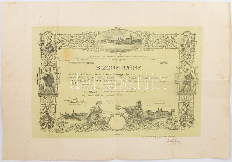 1912 Győr szab. kir. város ipartestülete által kiállított asztalos bizonyítvány (segédlevél), dekoratív grafikával, aláírásokkal, kissé foltos, 47x63 cm