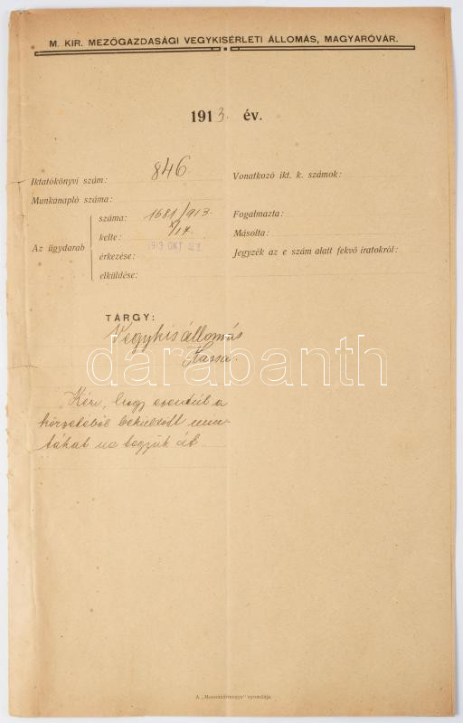 1913 Magyaróvár, M. kir. Mezőgazdasági Vegyikísérleti Állomás iratai