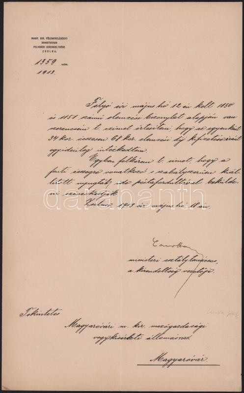 1913 Zsolna, Magyar Kir. Földművelésügyi Minisztérium felvidéki kirendeltségének hivatalos levele fejléces papíron