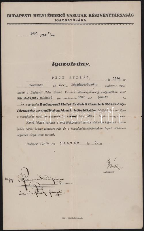 1928 Bp., Budapesti Helyi Érdekű Vasutak által kiállított igazolvány, rajta Bódy Tivadar Budapest polgármesterének aláírásával