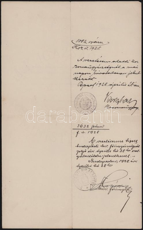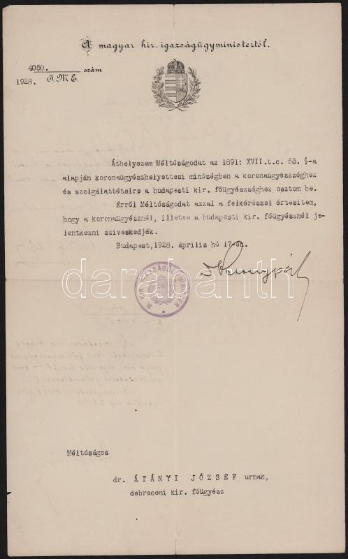 1928 Bp., Pesthy Pál (1873-1952) igazságügy-miniszter aláírása áthelyezési okmányon