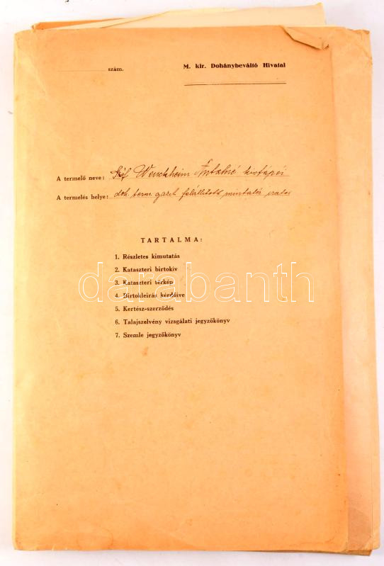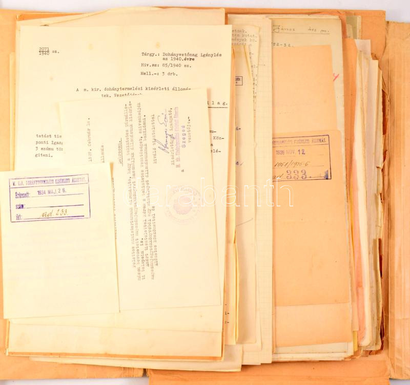 1930-1940 Dohánytermesztéssel kapcsolatos iratok, kimutatások, gróf Wenkheim Antalné kistápéi dohánytermelő kísérleti gazdaságának iratai, debreceni akadémia gazdasági iratai, stb.