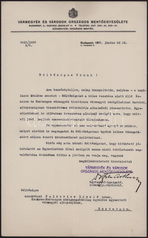 1930 Bp., Vármegyék és Városok Országos Mentőegyesülete fejléces levélpapírjára írt levél