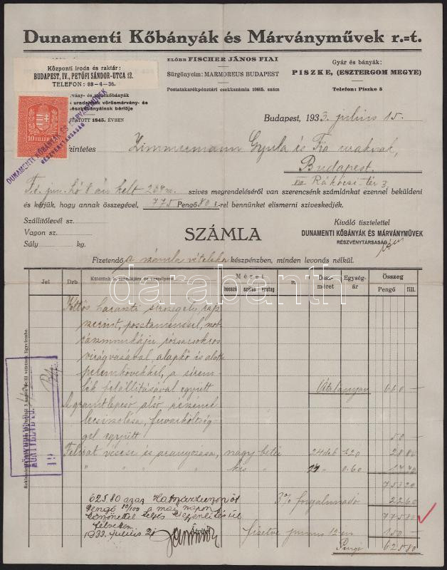 1933 Bp., Dunamenti Kőbányák és Márványművek Rt. fejléces számlája