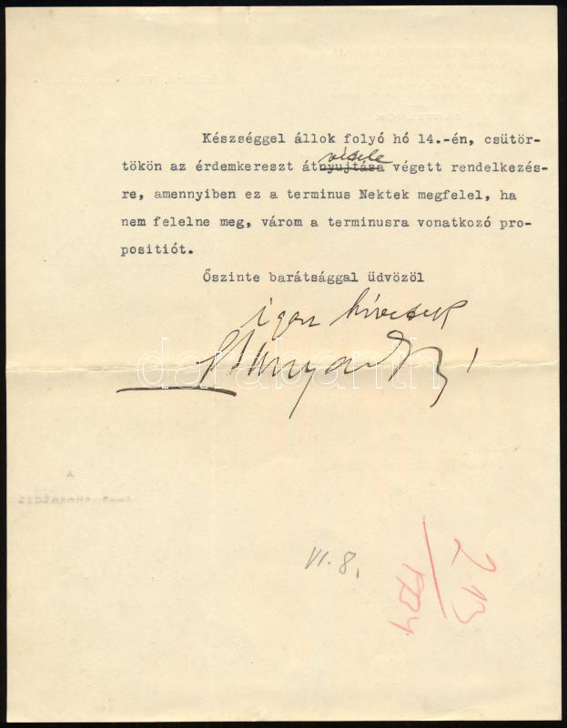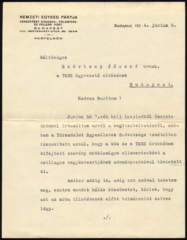 1934 Bp., Sztranyovszky Sándor, a képviselőház elnökének aláírása levélen