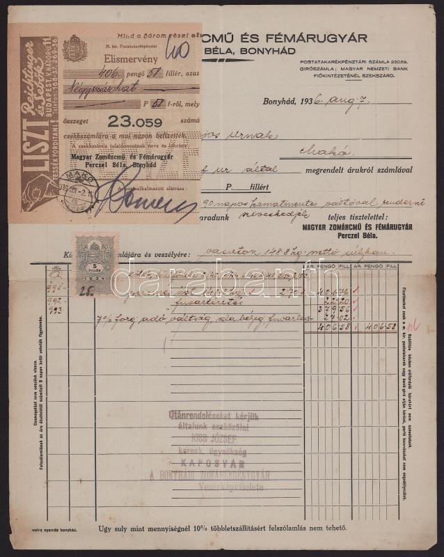 1936 Bonyhád, Magyar Zománcmű és Fémárugyár, Perczel Béla fejléces számla