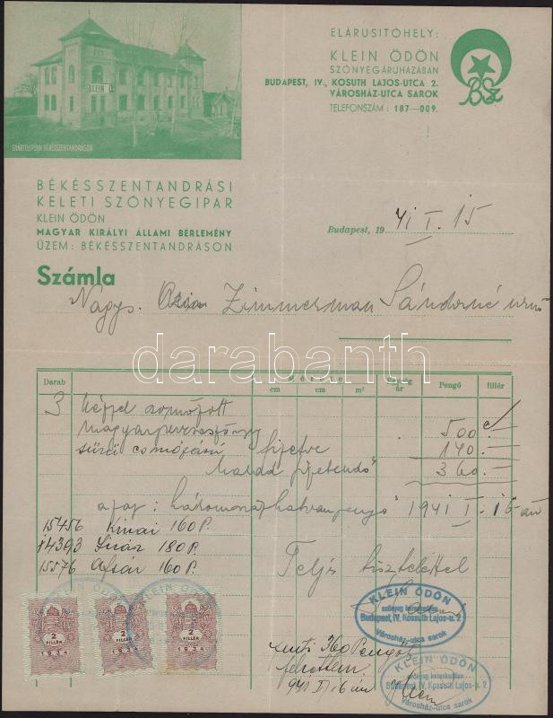 1941 Bp., Klein Ödön Békésszentandrási Keleti Szőnygipar fejléces számla