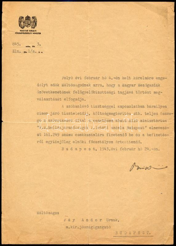 1943 Bp., Báró Bánffy Dániel (1893-1955) földművelésügyi miniszter aláírása hivatalos levélen