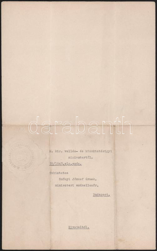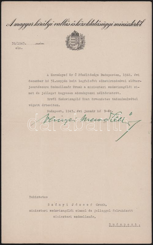1943 Bp., Szinyei Merse Jenő vallás- és közoktatásügyi miniszter aláírása hivatalos levélen