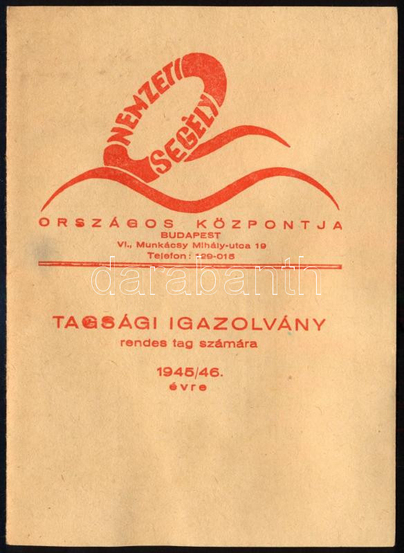 1945 A Nemzeti Segély Országos Központja tagsági igazolványa