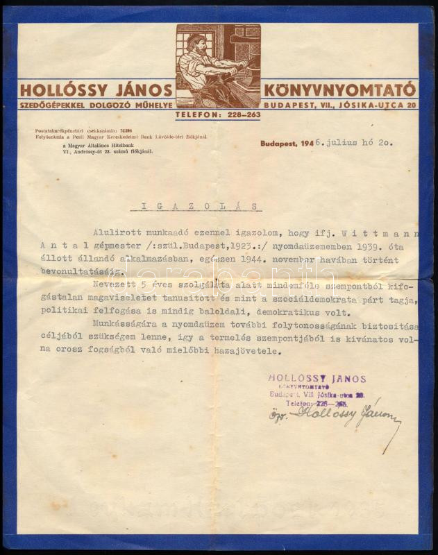 1946 Bp. VII., Hollósy János Könyvnyomtató által kiállított igazolás özv. Hollósy Jánosné aláírásával