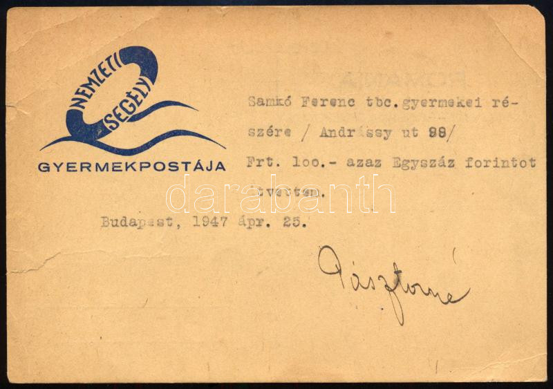1947 Bp., Nemzeti Segély gyermekpostája - Románia a magyar gyermekekért levelezőlap