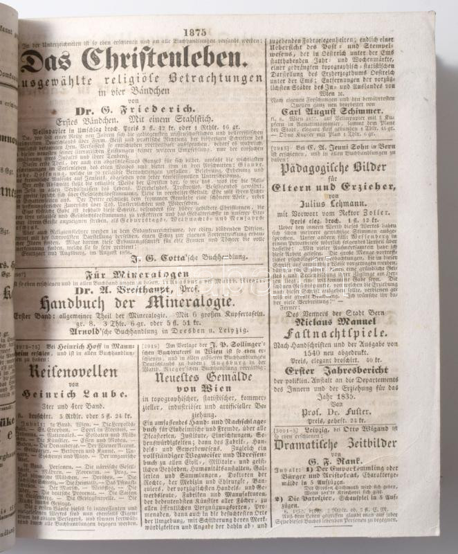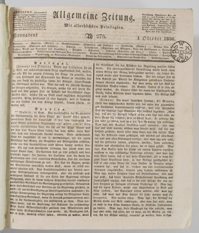 1836 Allgemeine Zeitung c. német nyelvű hírlap 275-366 számai egybe kötve (október-december). mind újság szignettával jó állapotban. Korabeli kartonált papírkötésben