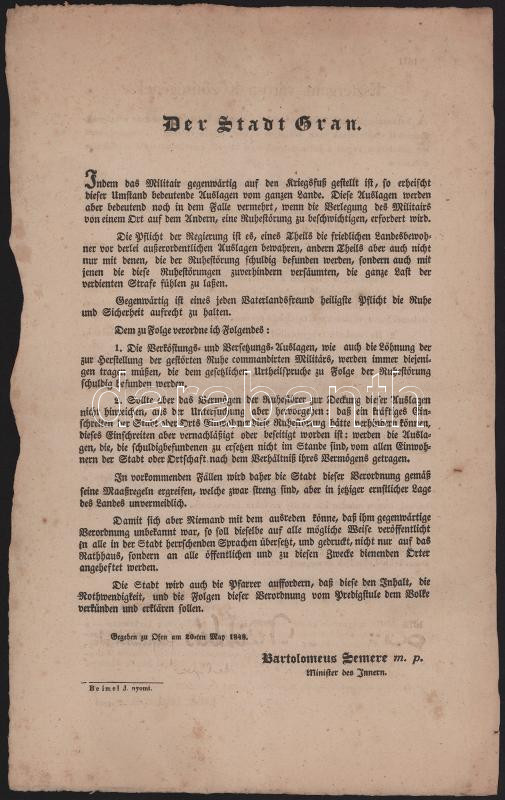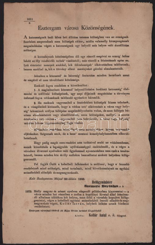 1848 Esztergom, Szemere Bertalan belügyminiszter május 20-án kelt hirdetménye Esztergom város közönségének, a közrend fenntartására vonatkozó rendelkezésekről, kétoldalas, magyar és német nyelvű, 39,5x24,5 cm